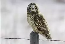 短耳鸮又名小耳木兔、田猫王、夜猫子等,是鸮形目鸱鸮科耳鸮属中小型猛禽动物。成鸟面盘显著,眼周黑色;眼先及内侧眉纹灰白色,面盘余部棕黄色杂以黑色细羽干纹;耳簇羽短小而几乎不外露,…全部>>