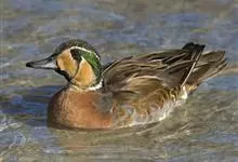 绿翅鸭是小型鸭类,体长37厘米,体重约0.5千克。嘴脚均为黑色。雄鸟头至颈部深栗色,头顶两侧从眼开始有一条宽阔的绿色带斑一直延伸至颈侧,尾下覆羽黑色,两侧各有一黄色三角形斑,在水中游泳时,极为醒目。…全部>>