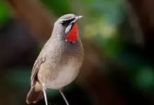 红点颏:是鸟纲、鹟科的鸣禽。又名西伯利亚歌鸲。体长14-17厘米,体重16-27克。雄鸟头部、上体主要为橄榄褐色。眉纹白色。颏部、喉部红色,周围有黑色狭纹。胸部灰色,腹部白色。雌鸟颏部、喉部不呈赤红色,…全部>>