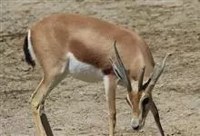 阿拉伯沙瞪羚:是偶蹄目、牛科、瞪羚属的食草动物。头尾长97厘米,身高约55-60厘米。雄性体重约为22千克,雌性性体重为18千克。雌雄都有犄角,雄性长达27厘米,雌性15厘米。体型较小。腿细长,…全部>>