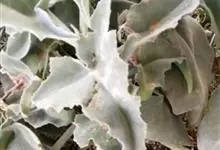 仙女之舞是景天科、伽蓝菜属植物。常绿肉质灌木,株高可达2-3米。幼株茎上有毛。叶有柄;单叶对生,阔卵状三角形,肉质;新叶开展,老叶正面凹、背面圆凸,缘具稀锯齿,橄榄绿色至灰绿色,被稠密的灰白色毛。…全部>>