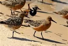 红腹滨鹬,是鹬科、滨鹬属的小型涉禽,体长23-25厘米,嘴较短而直、黑色,脚亦甚短、绿色。体较粗胖。夏季上体灰褐色具黑色中央纹,背具棕栗色和白色斑纹和羽缘,头侧和整个下体栗红色。冬季棕红色消失,…全部>>