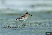 阔嘴鹬是涉禽,体长17厘米。特征为翼角常具明显的黑色块斑并具双眉纹。与黑腹滨鹬平滑下弯的嘴相比,阔嘴鹬的嘴具微小纽结,使其看似破裂。上体具灰褐色纵纹;下体白,胸具细纹;腰及尾的中心部位黑而两侧白。…全部>>