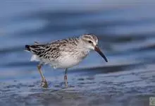 阔嘴鹬是涉禽,体长17厘米。特征为翼角常具明显的黑色块斑并具双眉纹。与黑腹滨鹬平滑下弯的嘴相比,阔嘴鹬的嘴具微小纽结,使其看似破裂。上体具灰褐色纵纹;下体白,胸具细纹;腰及尾的中心部位黑而两侧白。…全部>>