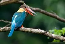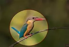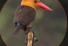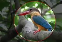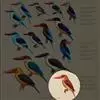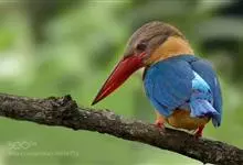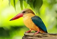 鹳嘴翡翠:体长33-37厘米。体重140-200克。共有13个亚种,体型大,嘴形巨大、侧扁,似鹳嘴,红色,嘴峰两侧有鼻沟。头灰褐色,上体蓝色,下体和宽阔的领环赭土色,脚红色。飞翔时翅上无斑。全部>>