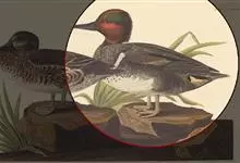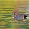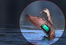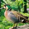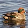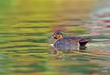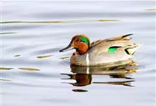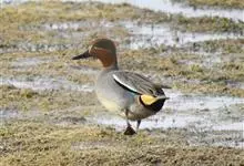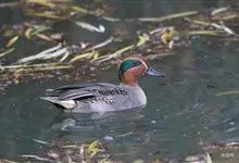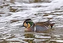 绿翅鸭是小型鸭类,体长37厘米,体重约0.5千克。嘴脚均为黑色。雄鸟头至颈部深栗色,头顶两侧从眼开始有一条宽阔的绿色带斑一直延伸至颈侧,尾下覆羽黑色,两侧各有一黄色三角形斑,在水中游泳时,极为醒目。…全部>>