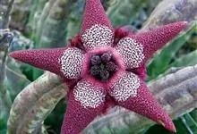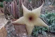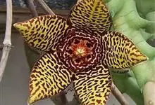巨花犀角又称大豹皮花,是夹竹桃科犀角属的一种植物。茎粗,花大,边缘生长细毛。植株柱形多分枝呈丛生,柱形具4棱,棱缘具细小疣突。花大,五角星形黄色,并有横向棕褐色斑纹,似豹皮而得名。花期夏秋两季。…全部>>