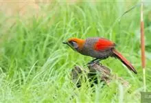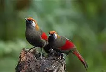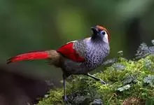 赤尾噪鹛中型鸟类,体长24~28厘米。头顶至后颈红棕色,两翅和尾鲜红色,眼先、眉纹、颊、颏和喉黑色,眼后有一灰色块斑。其余上下体羽大都暗灰或橄榄灰色。特征极明显,特别是通过鲜红色的头顶、翅和尾。…全部>>