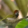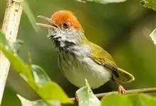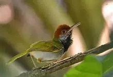 黑喉缝叶莺:体长11.5厘米,是一种小型的顶冠棕色、腹部白色的莺。尾甚长而常上翘,臀黄色,具特征性的偏黑色喉,上体橄榄绿色,头侧灰色。雌鸟色暗,头少红色且喉少黑色。与长尾缝叶莺的区别在后顶冠亦为棕色,…全部>>