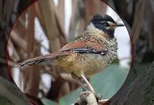 栗颈噪鹛是噪眉科、噪鹛属中型鸟类,体长22-25厘米。头顶至枕暗石板灰色,前额、头侧、颏、喉至上胸黑色,耳后至颈侧有一栗棕色块斑,在头后颈侧极为醒目。上体暗橄榄褐色,两翅黑褐色,初级飞羽外翈沾灰。…全部>>