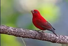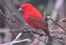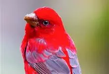 血雀雀科朱雀属鸟类,体重36-49克;体长155-182毫米。雄鸟除眼先、翼与尾为黑色外,通体为鲜红色;嘴鲜黄;雌鸟暗橄榄绿色,羽端较淡或带黄色;腰鲜黄;嘴较暗。虹膜褐色;嘴黄色;腿和脚褐色。…全部>>