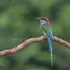 蓝喉蜂虎中型鸟类,体长26~28厘米。头顶至上背栗红色或巧克力色,过眼线黑色,腰和尾蓝色,翼蓝绿色,腰及长尾浅蓝,中央尾羽延长成针状,明显突出于外。颏喉蓝色,其余下体和两翅绿色。嘴细长而尖,黑色,…全部>>