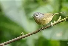 黄喉雀鹛是雀眉科、拟希鹛属小型鸟类,体长11-12厘米。头顶浅黄色具黑色鳞状斑,头顶两侧各有一道黑色侧冠纹,眉纹浅黄色、长而宽阔。上体灰绿色,两翅和尾褐色而具浅黄色窄缘。下体淡黄色。特征明显,…全部>>