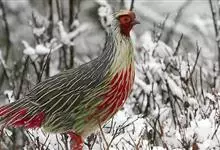 血雉雉科血雉属鸟类,别名血鸡、松花鸡,血雉的雄鸟大覆羽、尾下覆羽、尾上覆羽、脚、头侧、腊膜为红色,故称血雉。其别名甚多,各地皆异。在甘肃,因其胸侧和翅上覆羽沾绿,被称为“绿鸡”;因其羽毛形似柳叶,…全部>>