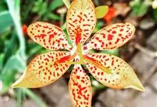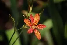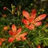 射干 Redouté)是鸢尾科射干属多年生草本植物。根状茎为不规则的块状,斜黄色或黄褐色;花橙红色,散生紫褐色的斑点;花药呈条形;子房下位,倒卵形;蒴果倒卵形或长椭圆形;种子圆球形,黑紫色,有光泽。…全部>>
