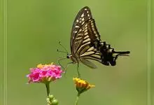 柑橘凤蝶是鳞翅目凤蝶科凤蝶属昆虫,又称柑橘黄凤蝶、花椒凤蝶、燕凤蝶。中型凤蝶。翅底色黑褐色,翅脉黑色,各翅室内具长短不一的黄白色斑;前翅中室具4条近乎平行的黄色线纹,后翅臀区具一枚橘红色的圆斑,…全部>>