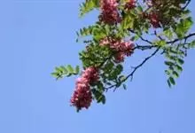 红花刺槐是豆科刺槐属的植物。其干皮深纵裂;枝具托叶刺,羽状复叶互生,叶片卵形或长圆形,具芒尖;基部圆形。花两性;总花序下垂;花冠粉红色,芳香;果条状长圆形,腹缝有窄翅。花期4~5月,果期9~10月。…全部>>