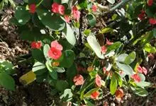 铁海棠为大戟科大戟属蔓生灌木植物;茎多分枝,具纵棱,呈旋转状;叶互生,通常集中于嫩枝上;每个花序基部边缘具微小的红色尖头;苞叶先端圆且具小尖头,无柄,上面鲜红色,下面淡红色;苞片丝状;子房光滑无毛,…全部>>