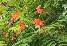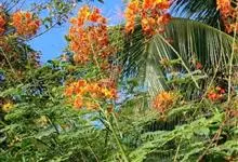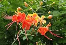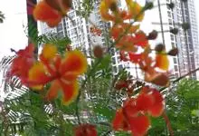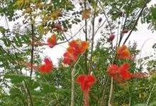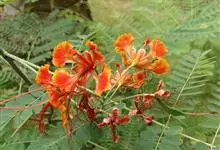 洋金凤 Sw.),豆科小凤花属灌木状或小乔木植物,枝无毛,绿或粉绿色;二回羽状复叶;总状花序伞房状,萼片无毛,花瓣橙红或黄色,圆形,花丝红色,子房无毛,花柱橙黄色;荚果窄而薄,…全部>>