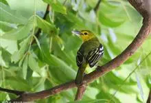 黑翅雀鹎:体重14-19克,体长11.5-16厘米。是树栖性绿色小鸟,外形与叶鹎相似,下体黄色。鸟喙直,翼长而尖,总体羽毛是绿色和黄色相结合,翼上具两道明显近白色横纹,翼近黑而羽缘白。…全部>>