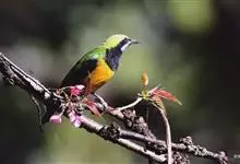 橙腹叶鹎体形大小和金额叶鹎相似,体长16~20厘米。额至后颈黄绿色,其余上体绿色,小覆羽亮钴蓝色,形成明显的肩斑。颏、喉、上胸黑色具钴蓝色髭纹,其余下体橙色。飞羽和尾羽雄鸟黑色、雌鸟绿色。…全部>>