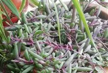 紫玄月是菊科厚敦菊属多年生肉质草本植物。蔓长30-60厘米;茎紫色;叶对生或互生茎上肉质,叶片细圆柱形,中间粗两端细稍弯曲;花序着生于叶腋,头状花序,舌状花黄色,管状花黄色;花期全年。…全部>>