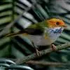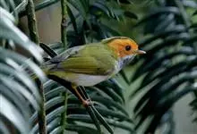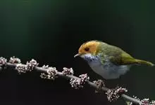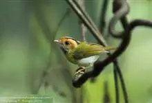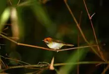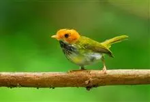 棕脸鹟莺:体长10厘米,是一种色彩亮丽而有特色的莺鸟。头栗色,具黑色侧冠纹。上体绿,腰黄色。下体白,颏及喉杂黑色点斑,上胸沾黄。与栗头鹟莺的区别在头侧栗色,白色眼圈不显著且无翼斑。…全部>>