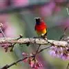绿喉太阳鸟:共有9个亚种。小型鸟类,雄鸟体长13-15厘米、雌鸟10-12厘米。雄鸟前额至后颈、颏和喉辉绿色,头侧黑色,颈侧和背暗红色,两肩、下背橄榄绿色,腰鲜黄色,尾上覆羽和中央尾羽暗绿色,…全部>>