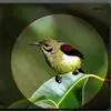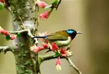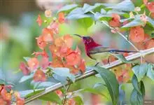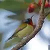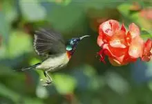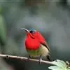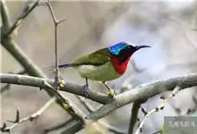 绿喉太阳鸟:共有9个亚种。小型鸟类,雄鸟体长13-15厘米、雌鸟10-12厘米。雄鸟前额至后颈、颏和喉辉绿色,头侧黑色,颈侧和背暗红色,两肩、下背橄榄绿色,腰鲜黄色,尾上覆羽和中央尾羽暗绿色,…全部>>