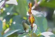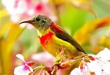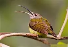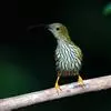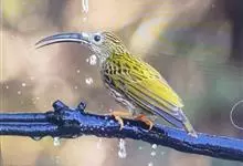 纹背捕蛛鸟:为太阳鸟科捕蛛鸟属的鸟类。是太阳鸟科中体型较大的一种,体重25-45克,体长160-210毫米。嘴粗长而尖且向下弯曲。上体橄榄黄色具黑色中央斑纹。下体淡黄白色满布黑色纵纹,尾具黑色次端斑。…全部>>