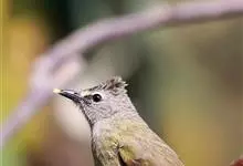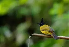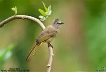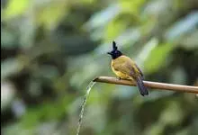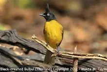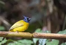 黑冠黄鹎:体长18-21厘米,是一种中等体型偏黄色鹎。整个头、颈、颏、喉黑色,头顶有显著直立的羽冠,黑色,上体褐橄榄黄绿色,下体橄榄黄色。虹膜偏红;嘴及脚黑色。…全部>>