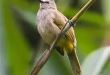 黄臀鹎,又称黄屁屁,是雀形目鹎科鹎属鸟类。成鸟额、头顶至枕部黑色,无明显冠羽,眼先和眼周亦为黑色,耳羽灰褐色,上体土褐色,尾暗褐色具不明显横斑,翼暗褐色,飞羽具淡色羽缘;下体颏、喉白色,…全部>>