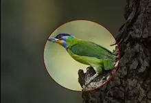 蓝翅叶鹎:小型鸟类,体长15-18厘米。雄鸟通体草绿色,尾蓝绿色,肩和翅亮蓝 色,胸缀有黄色,颏、喉黑色。雌鸟颏,喉蓝绿色。栖息在海拔1500米以下的常绿阔叶林、次生林和林缘疏林灌丛中。…全部>>