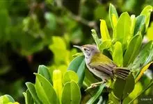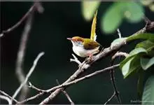 普通缝叶莺,是雀形目鹅科莺亚科缝叶莺属一种。体长10-14厘米,体重7-10克,雄鸟前额棕红,头顶至枕棕橄榄褐,上体橄榄绿染黄,飞羽及尾羽暗褐;繁殖期雄鸟的中央尾羽特形延长,下体淡皮黄白色。…全部>>