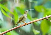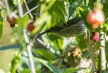 纹背捕蛛鸟:为太阳鸟科捕蛛鸟属的鸟类。是太阳鸟科中体型较大的一种,体重25-45克,体长160-210毫米。嘴粗长而尖且向下弯曲。上体橄榄黄色具黑色中央斑纹。下体淡黄白色满布黑色纵纹,尾具黑色次端斑。…全部>>