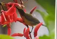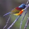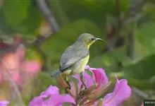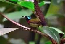 绿喉太阳鸟:共有9个亚种。小型鸟类,雄鸟体长13-15厘米、雌鸟10-12厘米。雄鸟前额至后颈、颏和喉辉绿色,头侧黑色,颈侧和背暗红色,两肩、下背橄榄绿色,腰鲜黄色,尾上覆羽和中央尾羽暗绿色,…全部>>