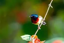 叉尾太阳鸟,雀形目太阳鸟科太阳鸟属留鸟;为小型鸟类,雄鸟头顶辉蓝绿色,上体橄榄绿色,腰明黄色,中央尾羽亮翠蓝色,羽轴针状延长,外侧尾羽黑色具白色端斑,头侧黑色,颜、喉和胸为绛红色,…全部>>