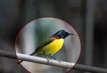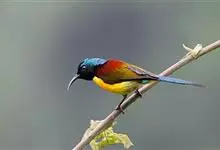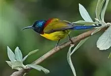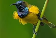 黄腹花蜜鸟是雀形目太阳鸟科花蜜鸟属鸟类。体型较小、喙略短而弯、腹部黄色。雄鸟繁殖季节颏及胸黑紫色并泛金属光泽,具有绯红色及灰色胸带,将上腹部黑色斑与前胸隔开,肩斑为橙黄色丝质羽,上体橄榄绿色,…全部>>