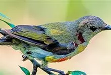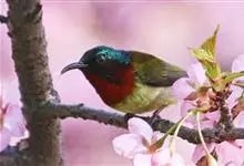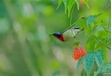 叉尾太阳鸟,雀形目太阳鸟科太阳鸟属留鸟;为小型鸟类,雄鸟头顶辉蓝绿色,上体橄榄绿色,腰明黄色,中央尾羽亮翠蓝色,羽轴针状延长,外侧尾羽黑色具白色端斑,头侧黑色,颜、喉和胸为绛红色,…全部>>