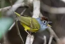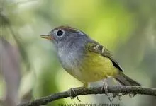 黑脸鹟莺:体长10厘米,是有特色的体小而多彩的莺鸟。粗眉纹,颏、喉及尾下覆羽黄色,脸罩黑,头顶及颈背灰色,上体绿,无翼纹,腹白。虹膜褐色;上嘴色深,下嘴肉色;脚偏绿色。…全部>>