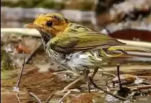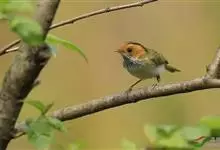 棕脸鹟莺:体长10厘米,是一种色彩亮丽而有特色的莺鸟。头栗色,具黑色侧冠纹。上体绿,腰黄色。下体白,颏及喉杂黑色点斑,上胸沾黄。与栗头鹟莺的区别在头侧栗色,白色眼圈不显著且无翼斑。…全部>>
