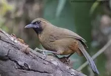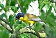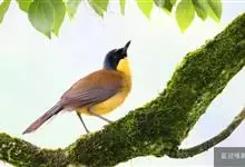 黄喉噪鹛体型略小,顶冠蓝灰色,特征为具黑色的眼罩和鲜黄色的喉。上体褐色,尾端黑色而具白色边缘,腹部及尾下覆羽皮黄色而渐变成白色。黄喉噪鹛隐匿于亚热带常绿林和浓密灌丛,于地面杂物中取食,喜食昆虫,…全部>>