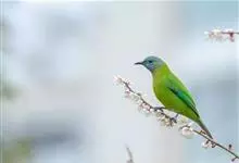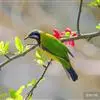 蓝翅叶鹎:小型鸟类,体长15-18厘米。雄鸟通体草绿色,尾蓝绿色,肩和翅亮蓝 色,胸缀有黄色,颏、喉黑色。雌鸟颏,喉蓝绿色。栖息在海拔1500米以下的常绿阔叶林、次生林和林缘疏林灌丛中。…全部>>
