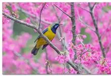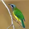 蓝翅叶鹎:小型鸟类,体长15-18厘米。雄鸟通体草绿色,尾蓝绿色,肩和翅亮蓝 色,胸缀有黄色,颏、喉黑色。雌鸟颏,喉蓝绿色。栖息在海拔1500米以下的常绿阔叶林、次生林和林缘疏林灌丛中。…全部>>