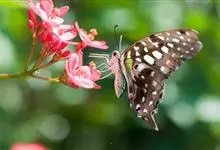 青带凤蝶Graphium sarpedon ,又名青凤蝶,是最普遍的中型凤蝶,飞行速度很快。青带凤蝶的翅膀中央有许多浅蓝色的斑点,很整齐地排列成一条直线。这些斑点由上而下逐渐变大,就像一条青色的带子。全部>>