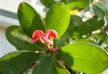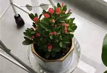 铁海棠为大戟科大戟属蔓生灌木植物;茎多分枝,具纵棱,呈旋转状;叶互生,通常集中于嫩枝上;每个花序基部边缘具微小的红色尖头;苞叶先端圆且具小尖头,无柄,上面鲜红色,下面淡红色;苞片丝状;子房光滑无毛,…全部>>