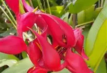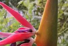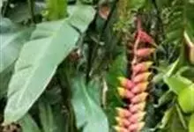 金嘴蝎尾蕉:芭蕉科,蝎尾蕉属多年生草本植物。株高可达6米。叶片长圆形,叶面绿色,叶背亮紫色;顶生花序,直立,薄被短柔毛;苞片绿色,开放时突露,花被片红色,顶端绿色,狭圆柱形,果三棱形,灰蓝色,有种子…全部>>