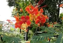 洋金凤 Sw.),豆科小凤花属灌木状或小乔木植物,枝无毛,绿或粉绿色;二回羽状复叶;总状花序伞房状,萼片无毛,花瓣橙红或黄色,圆形,花丝红色,子房无毛,花柱橙黄色;荚果窄而薄,…全部>>