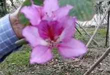 洋紫荆:落叶乔木;树皮暗褐色,近光滑;幼嫩部分常被灰色短柔毛;枝广展,硬而稍呈之字曲折,无毛。叶近革质,广卵形至近圆形,宽度常超过于长度,先端2裂达叶长的1/3,裂片阔,钝头或圆,两面无毛或下面略被…全部>>