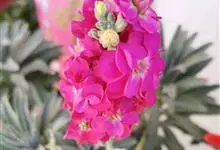 紫罗兰 W.T.Aiton)是十字花科紫罗兰属植物。二年生或多年生草本。植株高60厘米,布满灰白色的分枝柔毛;茎直立,多分枝,基部稍木质化;叶片为长圆形、倒披针形或匙形;总状花序顶生和腋生;花多数,…全部>>